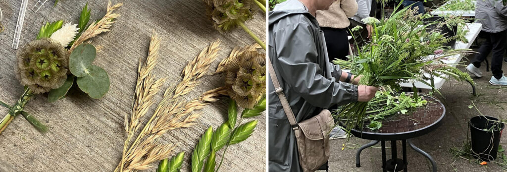 Gennem ugen bevæger vi os fra de små velkomstsmykker – som knaphulsblomster og hårpynt – til store landart-konstruktioner, hvor naturens materialer og farver danner ramme om smukke, bæredygtige værker. Vi samler materialer på gåture i skoven og langs grøftekanter, og arbejder bæredygtigt med lokale og sæsonaktuelle planter.